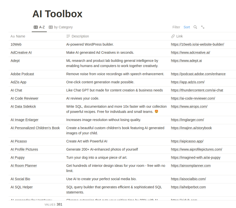 Introducing the Ultimate AIToolBox, a carefully curated Notion page featuring over 380+ innovative AI-powered tools designed to help you boost your productivity and remain competitive in today's fast-paced world 🌐. With an easy-to-navigate interface and a vast selection of resources, the Ultimate AIToolBox is the perfect companion for professionals in marketing, engineering, business, and beyond 🏢.